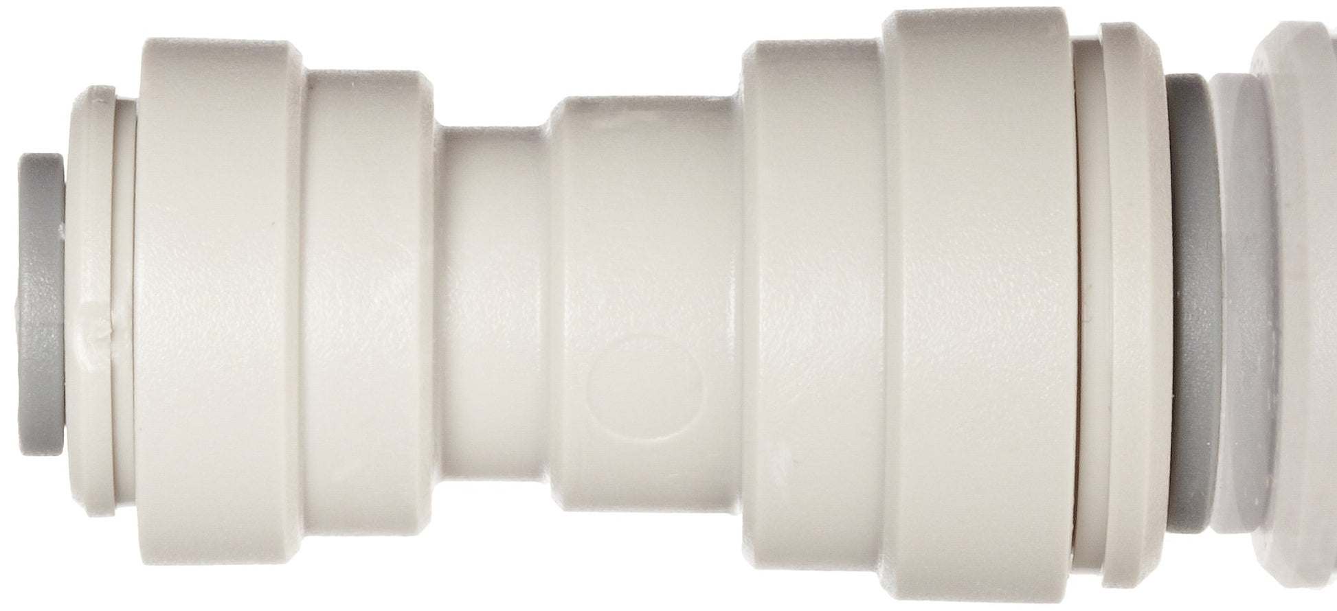 Details: This John Guest reducing straight union fitting is made of acetal copolymer and has tube connectors. This reducing straight union fitting is for connecting and disconnecting two inline pipes of different diameters more easily than using couplings. It is a push-to-connect fitting that accepts the insertion of nylon, soft nylon and polyurethane tube fittings. The fitting is made of acetal copolymer plastic, which has low moisture absorption, high tensile and flexural strength, and is hard and fatigue resistant. The working pressure for this fitting is up to 150 pounds per square inch (psi), and it meets National Sanitation Foundation (NSF)/American National Standards Institute (ANSI) standards 14, 51, and 61 for plastic piping systems, food equipment materials, and use with drinking (potable) water.
